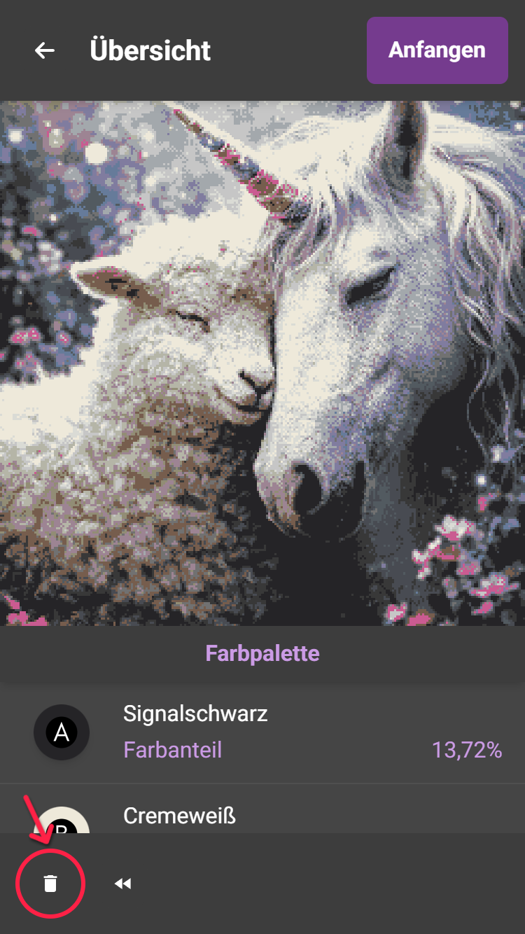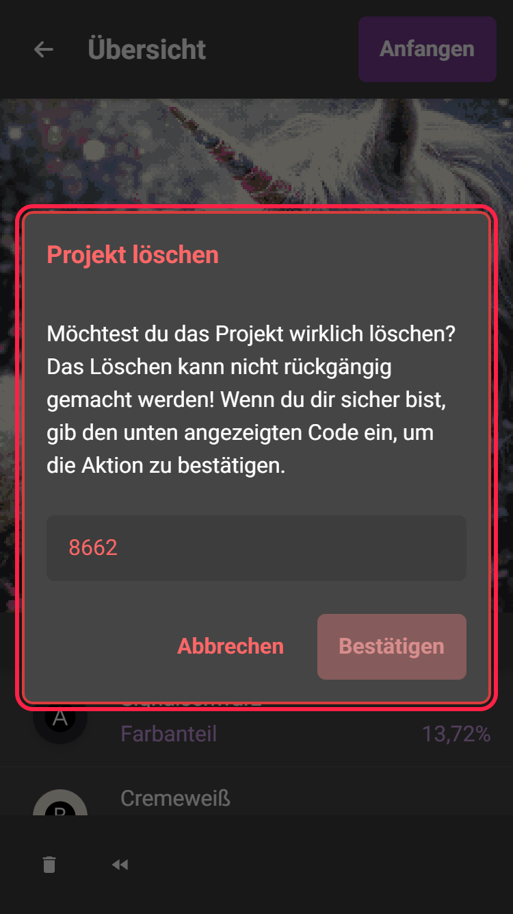 Drückt ihr auf das Mülleimer Symbol müsst ihr einen 4-stelligen Zahlencode eingeben, um euer Projekt endgültig zu löschen.