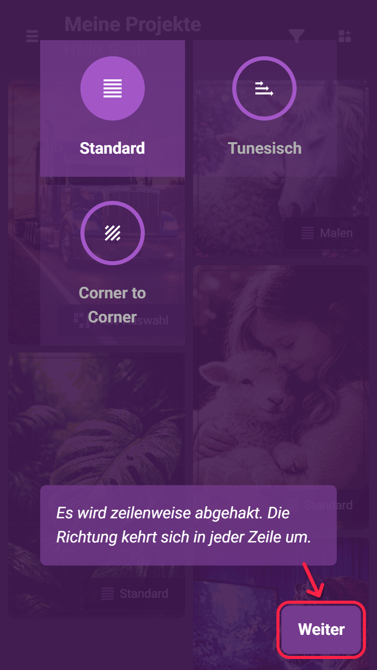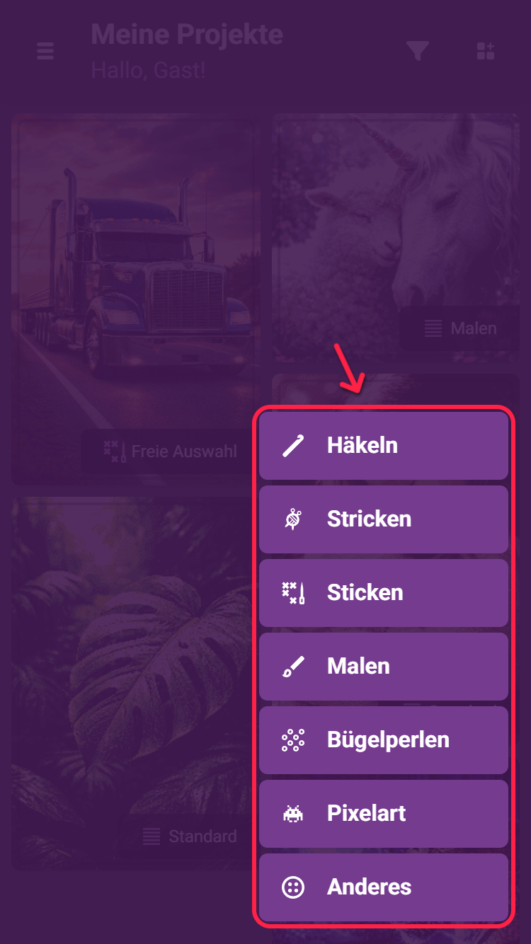 Seit den Versionen 1.40 (Android) und 1.20.0 (iOS) gibt es vor der Projekterstellung die Auswahl der Handarbeitsart.