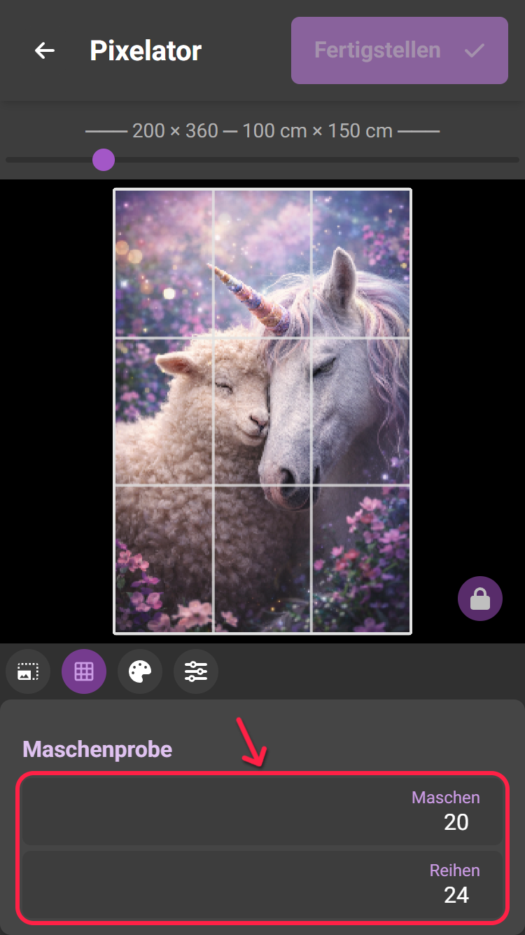 Hast du dein deine gewünschte Größe und deinen Bildausschnitt eingerichtet geht es weiter mit deiner Maschenprobe.