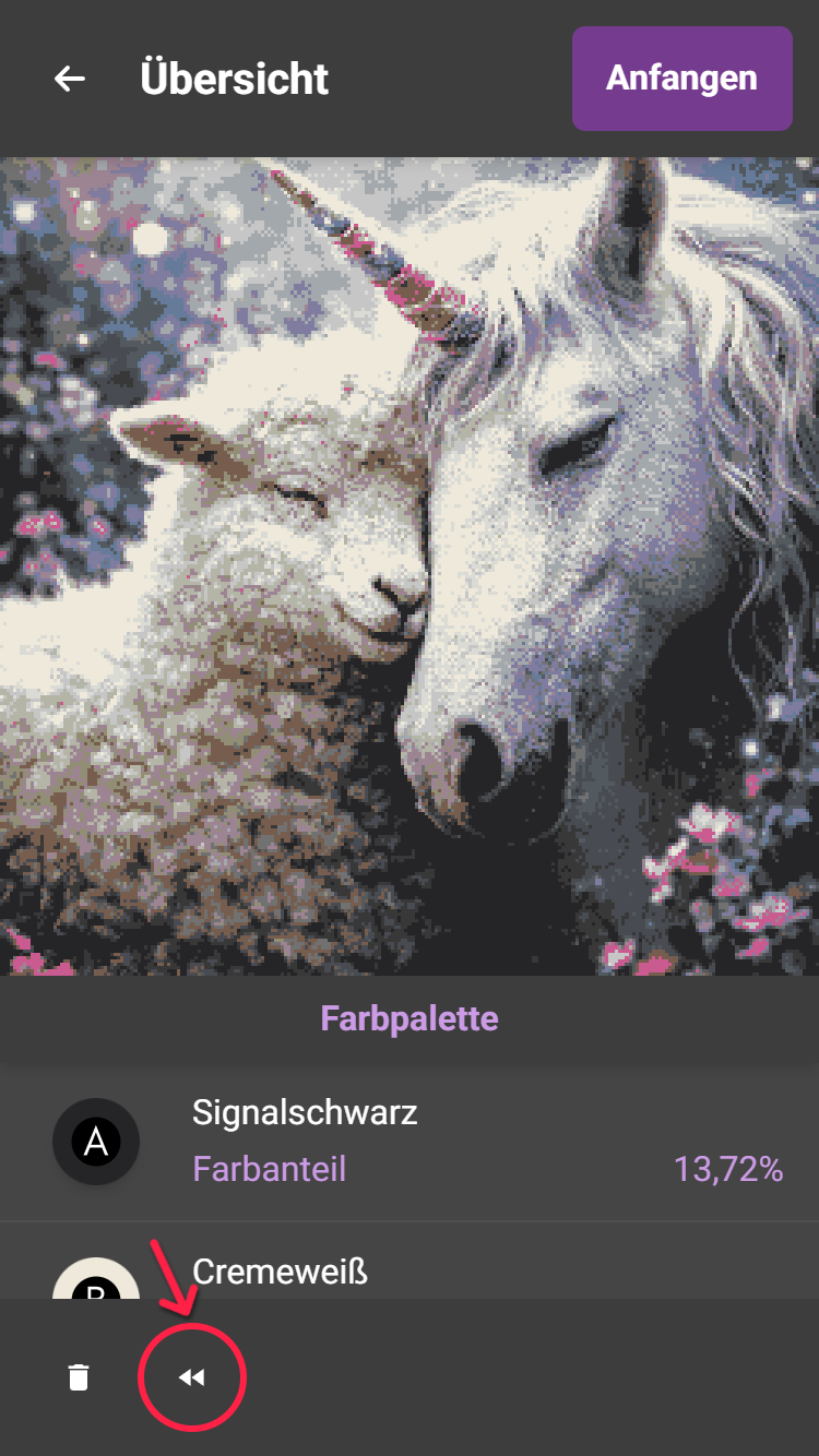 Um ein Projekt zurückzusetzen, drücke in der Projektübersicht den Rewind-Button am unteren Bildschirmrand.