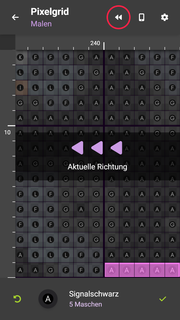 Die aktuelle Häkelrichtung wird eingeblendet, wenn du ...