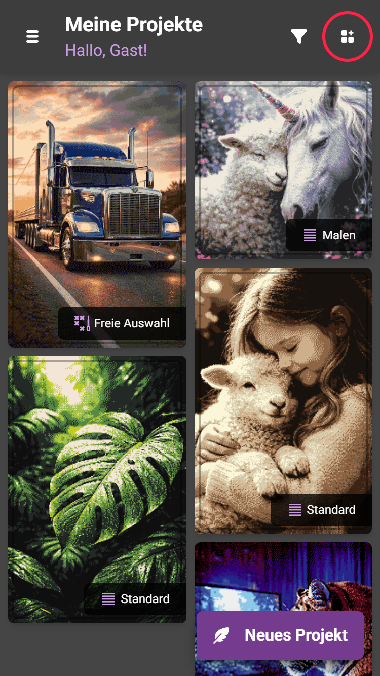 Das Maschenprobenheft findest du jetzt nicht mehr im alten Seitenmenü, sondern über das Icon oben rechts auf der Projektübersicht. Dort öffnet sich die App-Übersicht, in der du das Maschenprobenheft direkt auswählen kannst.