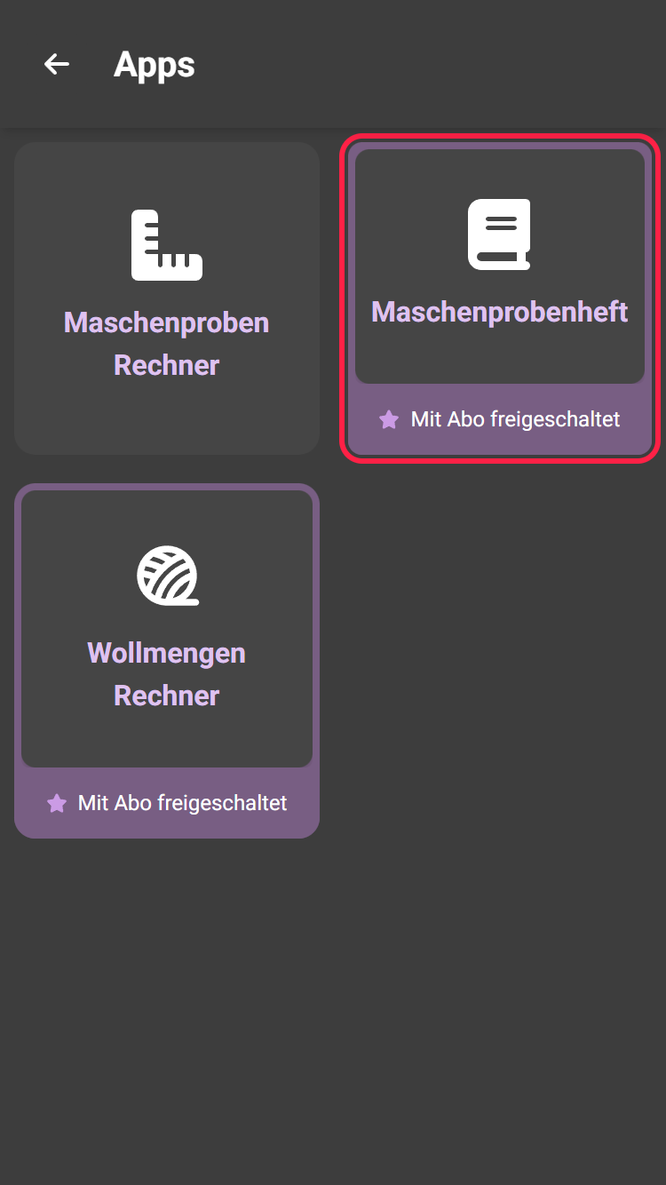 Deine Maschenproben legst du in der App-Übersicht an und verwaltest sie dort auch. Tippe dafür in der Projektübersicht oben rechts auf das Apps-Icon und öffne das Maschenprobenheft.